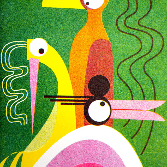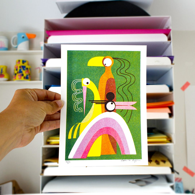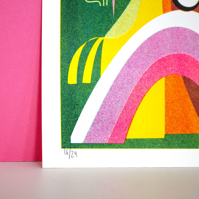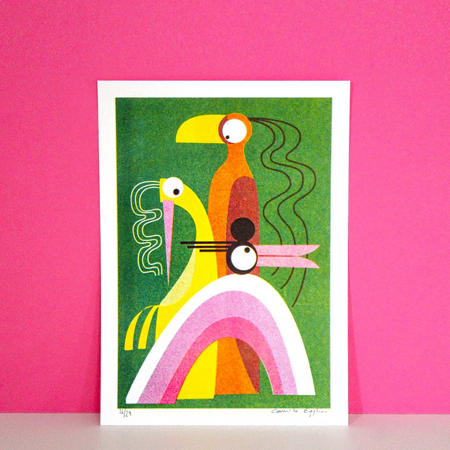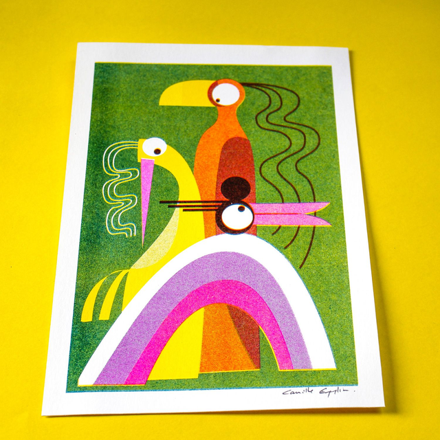 -Risographie en 3 couleurs : Jaune - Rose Fluo - Bleu Canard