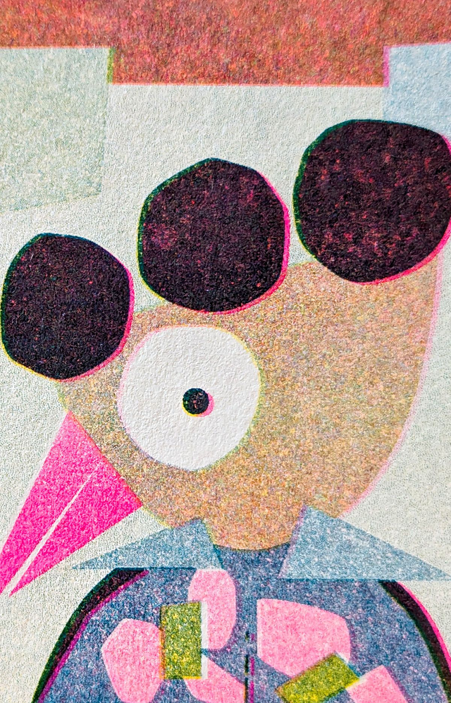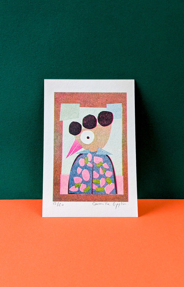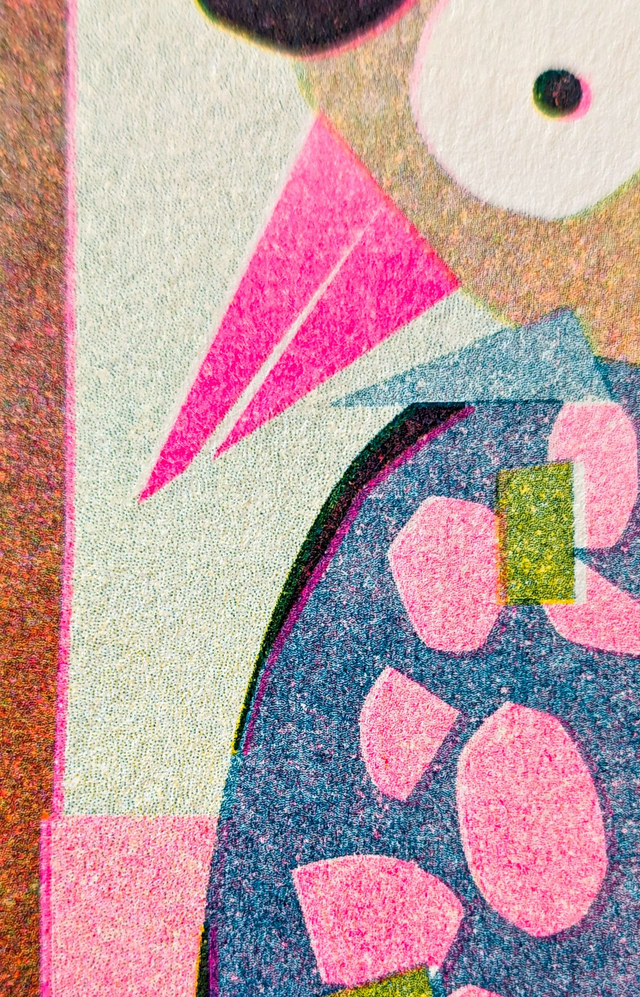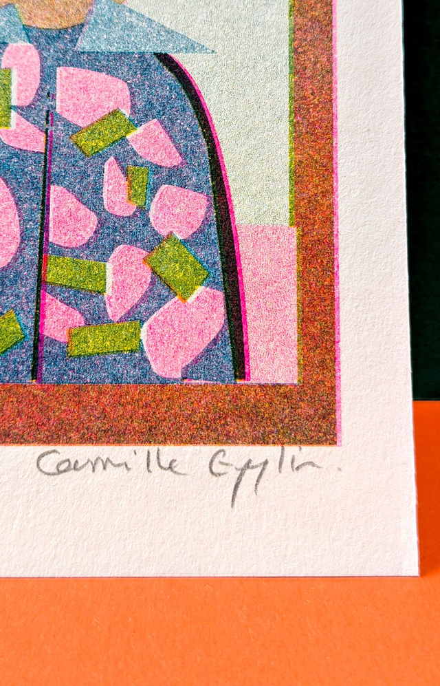 -Risographie** en 3 passages de couleur* : Jaune - Rose Fluo - Bleu Canard