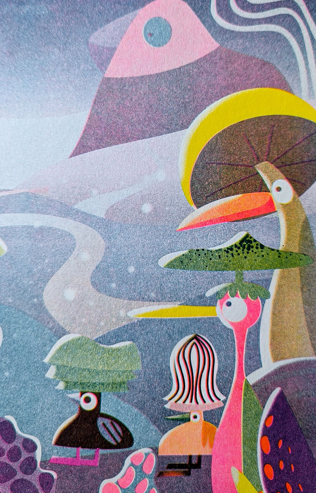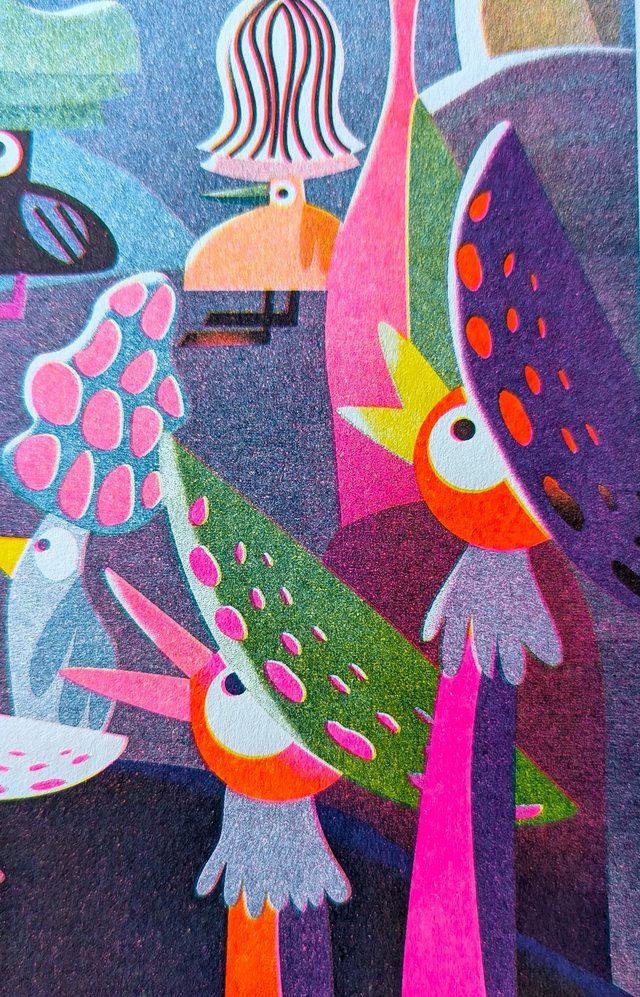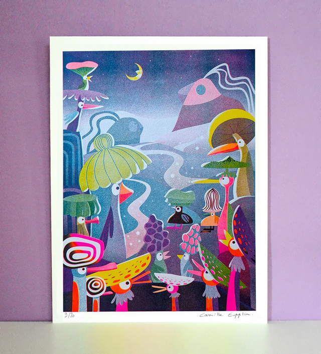 -Risographie** en 3 passages de couleur* : Jaune - Rose Fluo - Bleu Canard