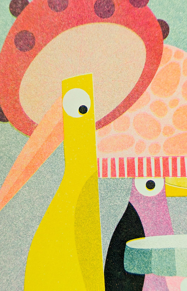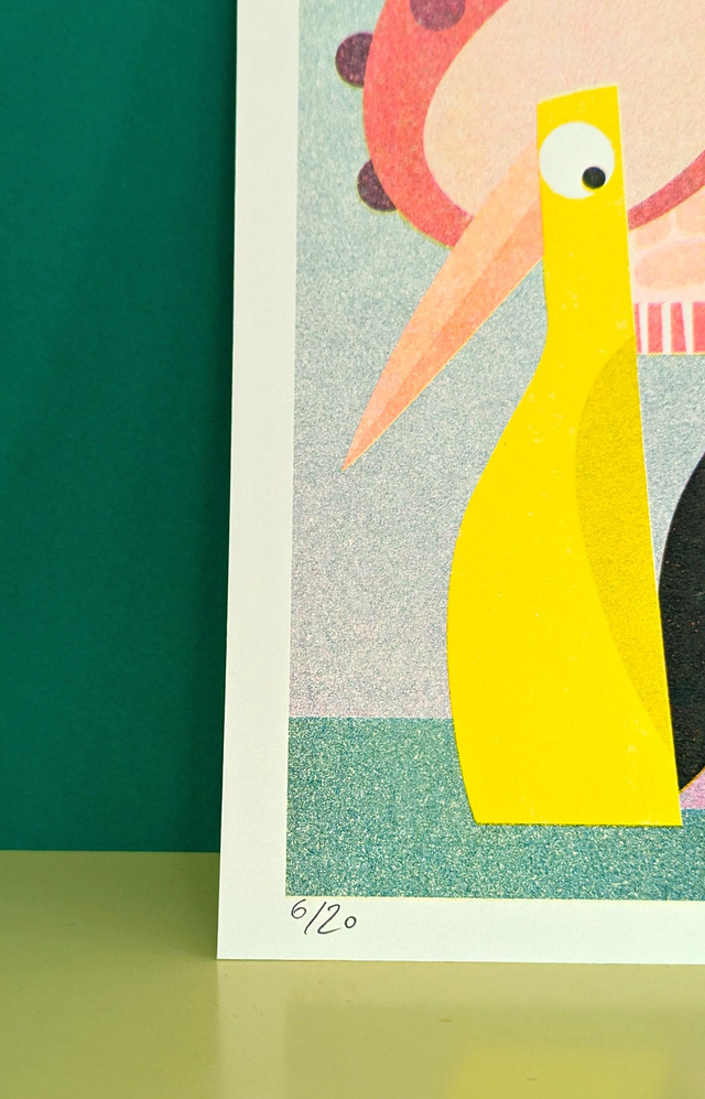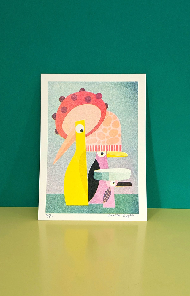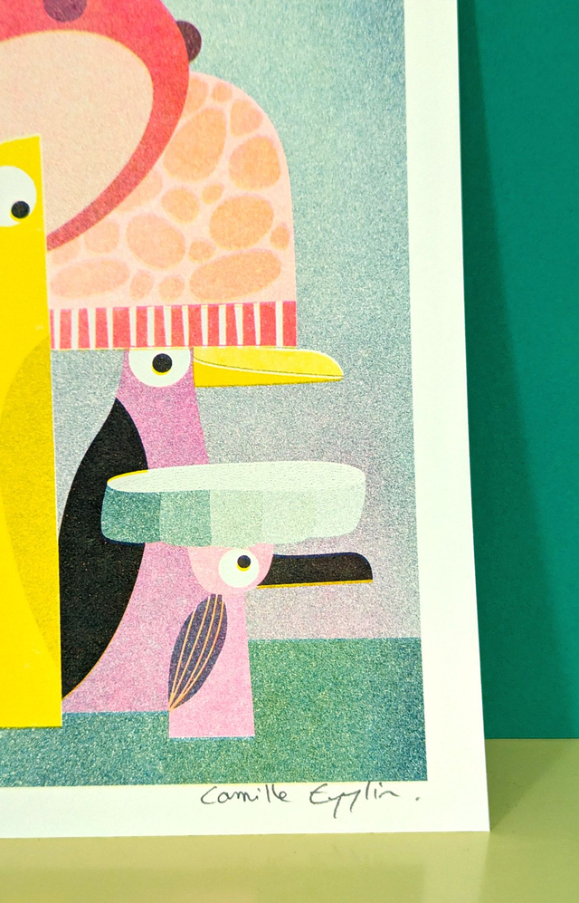 -Risographie** en 3 passages de couleur* : Jaune - Rose Fluo - Bleu Canard
