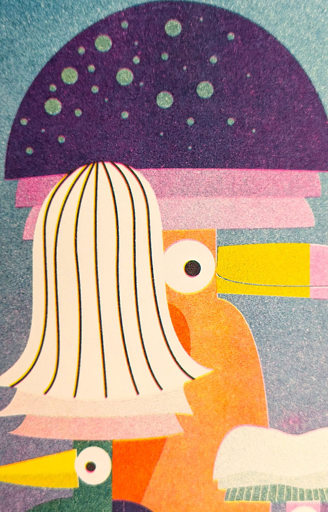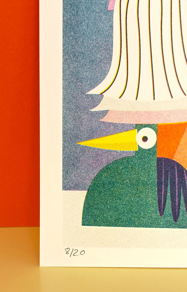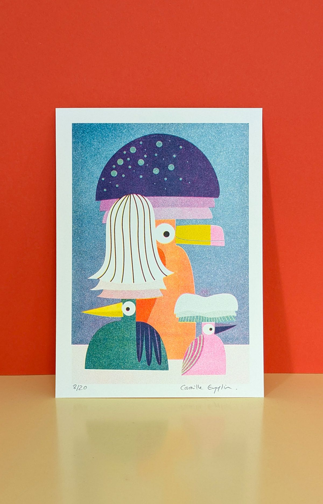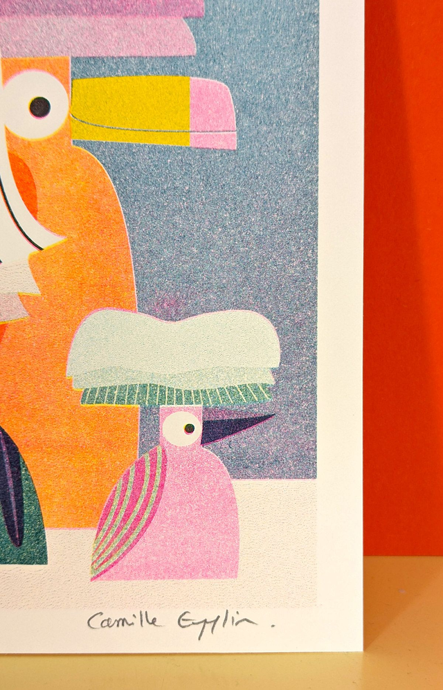 -Risographie** en 3 passages de couleur* : Jaune - Rose Fluo - Bleu Canard