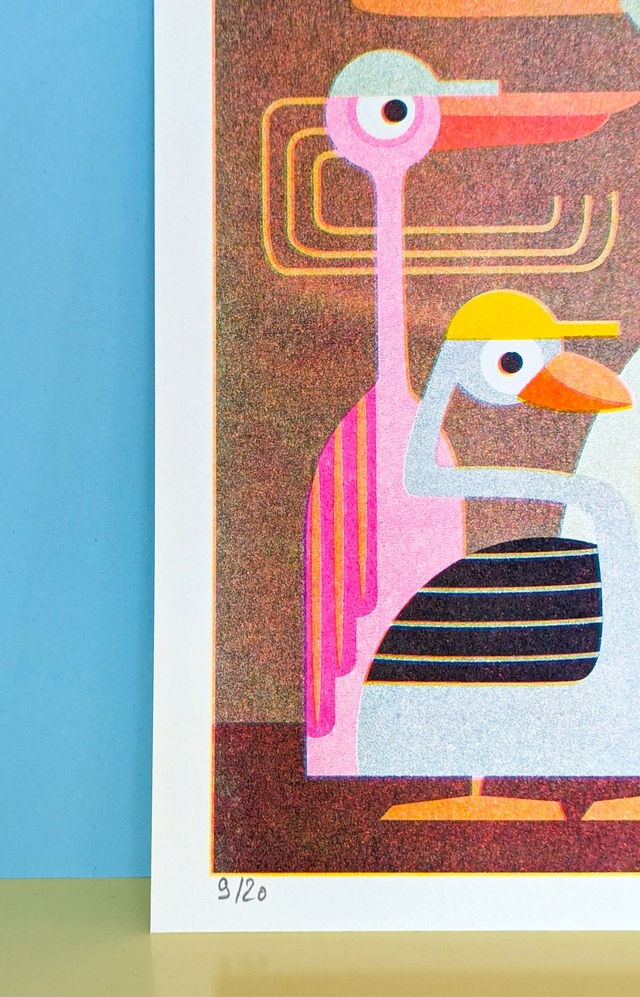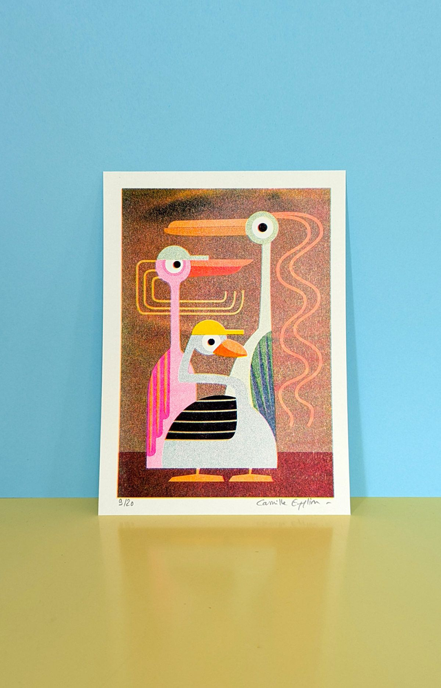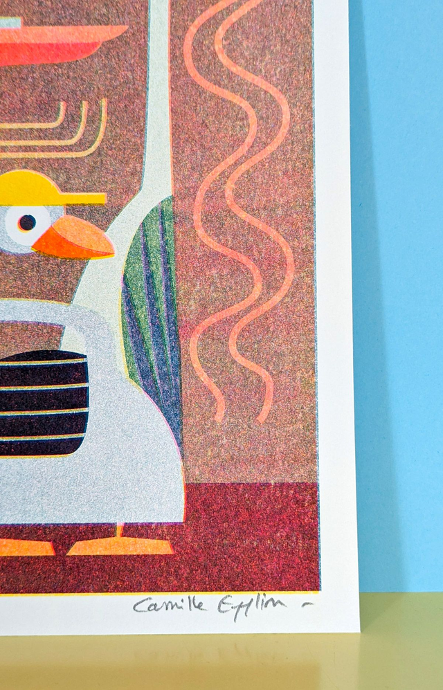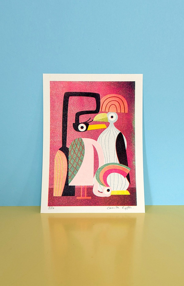 -Risographie** en 3 passages de couleur* : Jaune - Rose Fluo - Bleu Canard