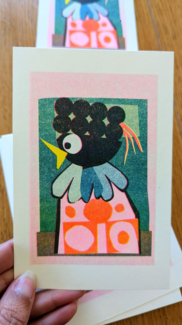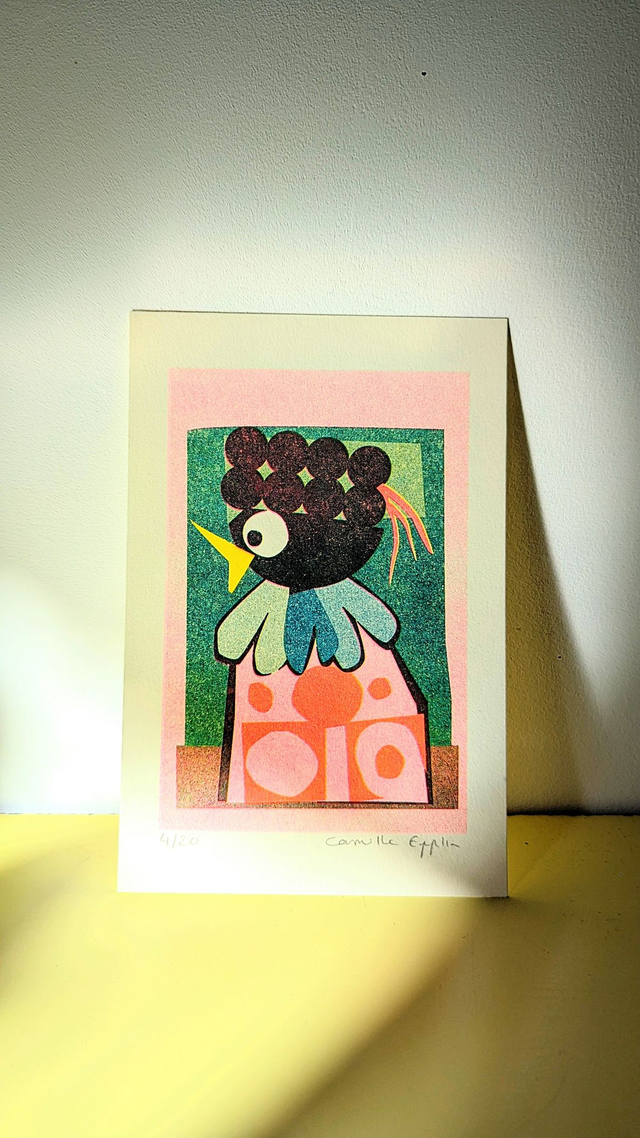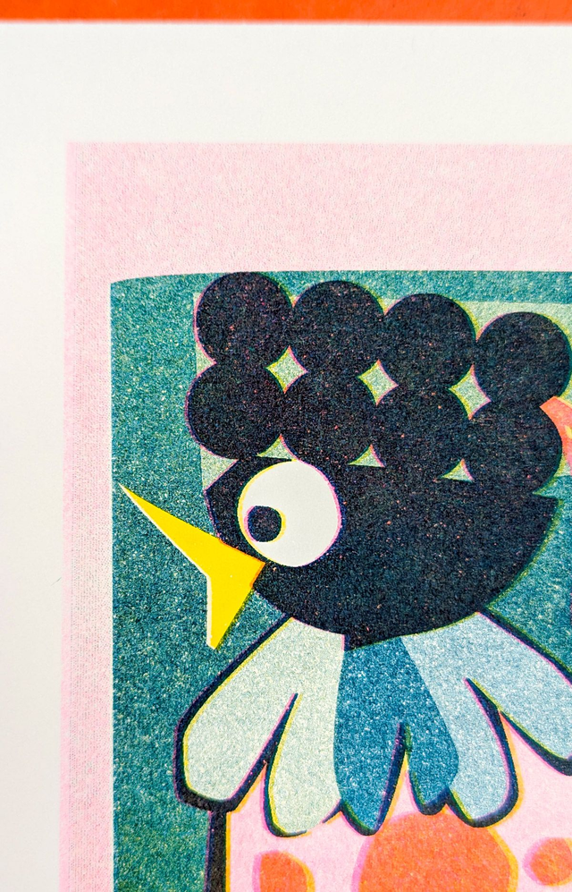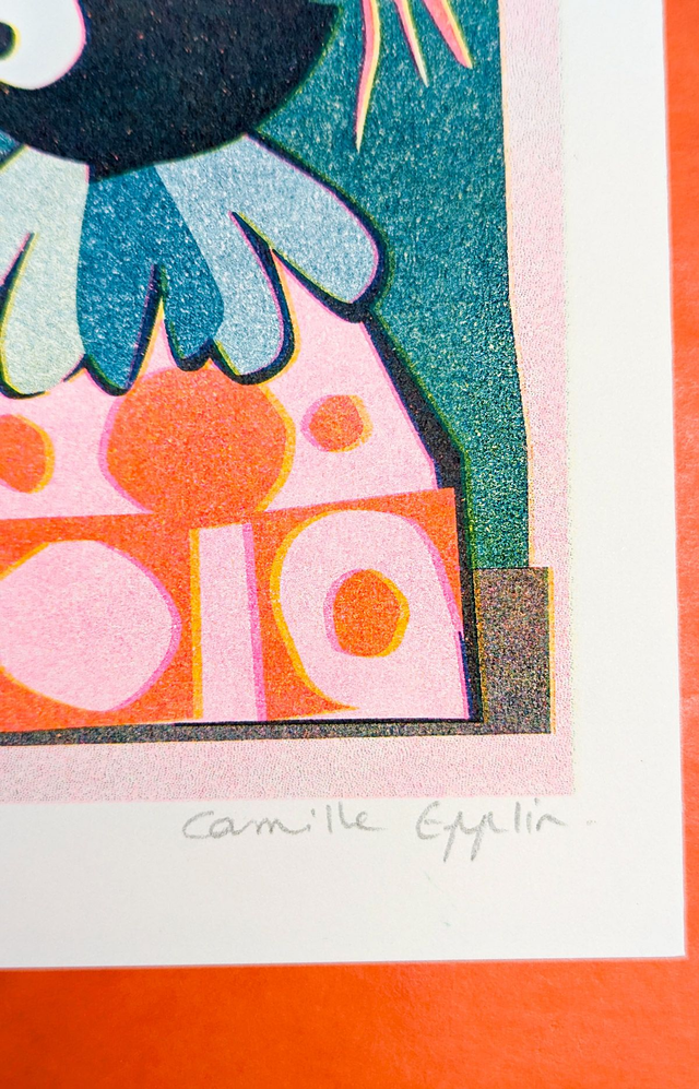-Risographie** en 3 passages de couleur* : Jaune - Rose Fluo - Bleu Canard